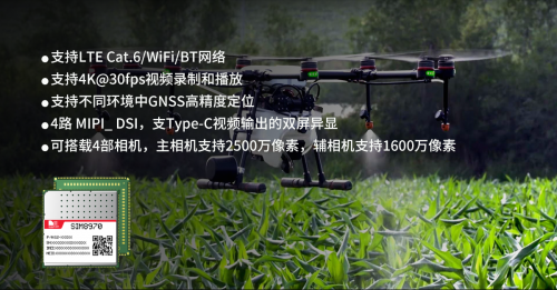 例如,芯讯通智能模组SIM8970系列具备LTE Cat.6高速数据传输和GNSS定位能力,可支持农用无人机按规划路径进行远程控制喷药作业,做到不遗漏、不重复。SIM8970集成8核CPU和高性能图像处理器,可搭载高清3D成像相机和多光谱相机,能帮助管理人员快速掌握农作物的长势、病虫害、倒伏率、成熟度、亩穗情况,这些数据传动送到管理平台,通过比对不同品种的优劣,能为选择综合性状优良的品种提供直接依据。