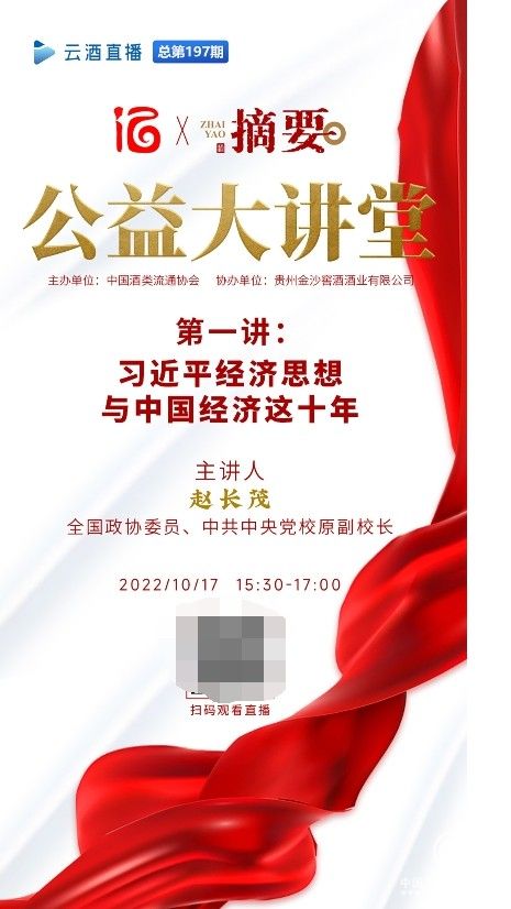 10月17日,由中国酒类流通协会主办,贵州金沙窖酒酒业有限公司协办的“摘要·公益大讲堂”,将在云酒直播等平台同步“开讲”。