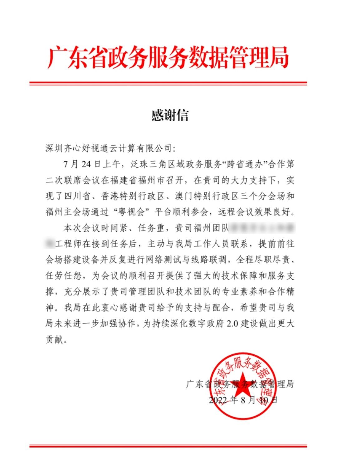 感谢信分别来自中共广东省委党校(广东行政学院)、中共惠州市委党校、广东省政务服务数据管理局及江门市政务服务数据管理局,信中对好视通专业细致的支持保障、高清流畅的云视频会议体验、丰富的产品应用给予了充分肯定与认可。