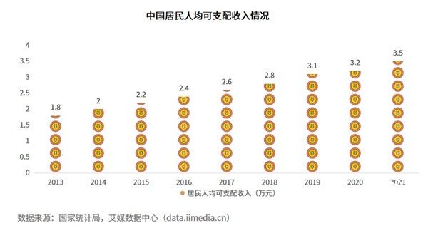 中国居民服务性消费增长潜力巨大,2013-2021年中国居民人均可支配收入逐年上升,至2021年达到3.5万元。