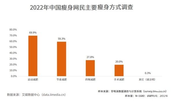 数据显示,2022年,中国瘦身网民最主要的瘦身方式为运动减肥,占比为69.9%,以及节食减肥,占比为59.3%。