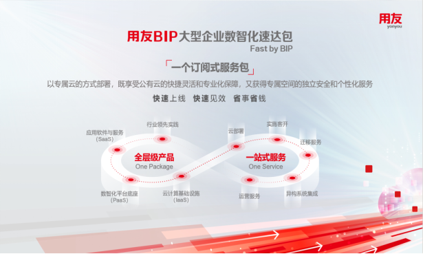 用友BIP大型企业数智化速达包Fast by BIP以专属云的方式部署,提供One Package全层级产品、One Service一站式服务及整体解决方案,让企业既享受公有云的快捷灵活和专业化保障,又获得专属空间的独立安全和个性化服务。目前全面适配了IaaS、PaaS、SaaS及专业服务,通过专业技术工具,帮助企业快捷、经济、安全迁移上云。让企业减少了复杂的IT基础设施与资源部署,一键直达应用,并享受云端带来的持续创新和迭代,快速上线、快速见效。