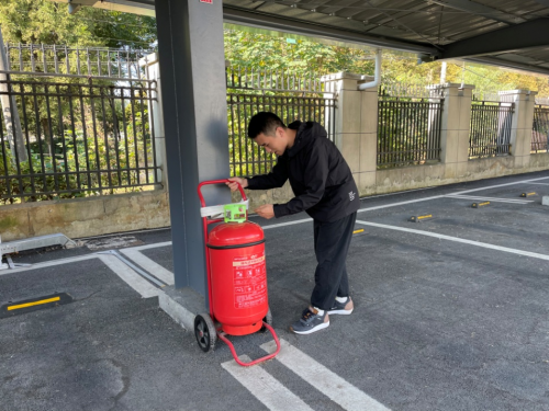 图为安全管理员检查消防器材是否正常(唐赟秋/摄)