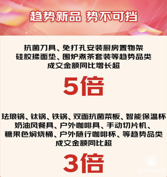 随着生活水平的提升,消费者追求高颜值、健康、智能等趋势的厨具好物。京东11.11期间,抗菌刀具、免打孔安装厨房置物架、硅胶揉面垫、围炉煮茶套装等趋势品类成交额同比增长超5倍。珐琅锅、钛锅、铁锅、双面抗菌菜板、智能保温杯、奶油风餐具、户外咖啡具、手动切片机、糖果色焖烧桶、户外随行咖啡杯等趋势品类成交额同比增长超3倍。