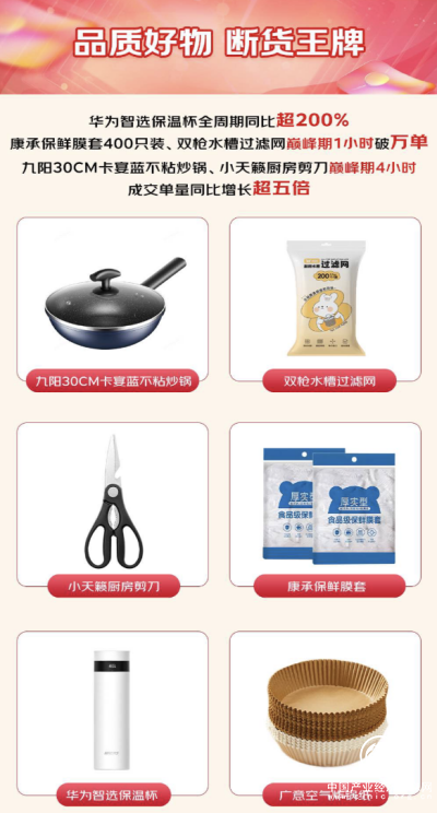 国货消费热持续,众多国货品质好物受消费追捧,成断货王牌。数据显示,京东11.11期间,华为智选保温杯全时期同比增长超200%,康承保鲜膜套400只装、双枪水槽过滤网巅峰期1小时破万单,九阳30CM卡宴蓝不粘炒锅、小天籁厨房剪刀巅峰期4小时成交单量同比增长超5倍。