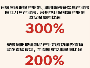 今年以来,京东通过“春晓计划”发布了一系列商家扶持举措,有效带动了大量中小微商家入驻京东。数据显示,京东11.11期间,石家庄珐琅锅产业带、潮州陶瓷餐饮具产业带、阳江刀具产业带、台州塑料保鲜盒产业带成交额同比增长超300%,安徽凤阳玻璃制品产业带成交单量同比增长超200%。值得关注的是,11月7日安徽凤阳玻璃制品产业带成功举办首场政企直播专场,直播间内销售十分火爆,2分钟突破500单、半小时突破1000单,最终达成成交额环比提升14倍、成交单量环比提升15倍的亮眼成绩。