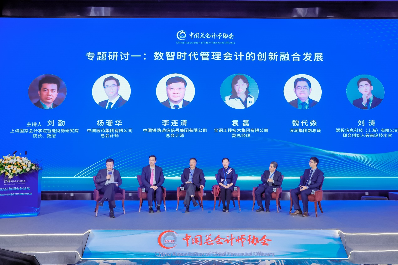 第一场专题研讨主题为“数智时代管理会计的创新融合发展”,由上海国家会计学院刘勤教授主持。中国铁路通信信号集团有限公司总会计师李连清、中国医药集团有限公司总会计师杨珊华、浪潮集团副总裁魏代森、宝钢工程技术集团有限公司副总经理袁磊、颖投信息科技(上海)有限公司联合创始人兼CTO刘涛参加讨论。嘉宾们围绕数智新技术对管理会计发展的影响展开了热烈讨论,认为数智时代下,应用大数据、人工智能等新技术极大地促进了管理会计的应用创新与落地,有助于加快业财融合进程,为助力建设世界一流企业提供有力支撑;同时,在管理会计的绩效与风险部分,引入ESG的思想和框架,将有助于企业提升财务绩效和抵御风险能力。