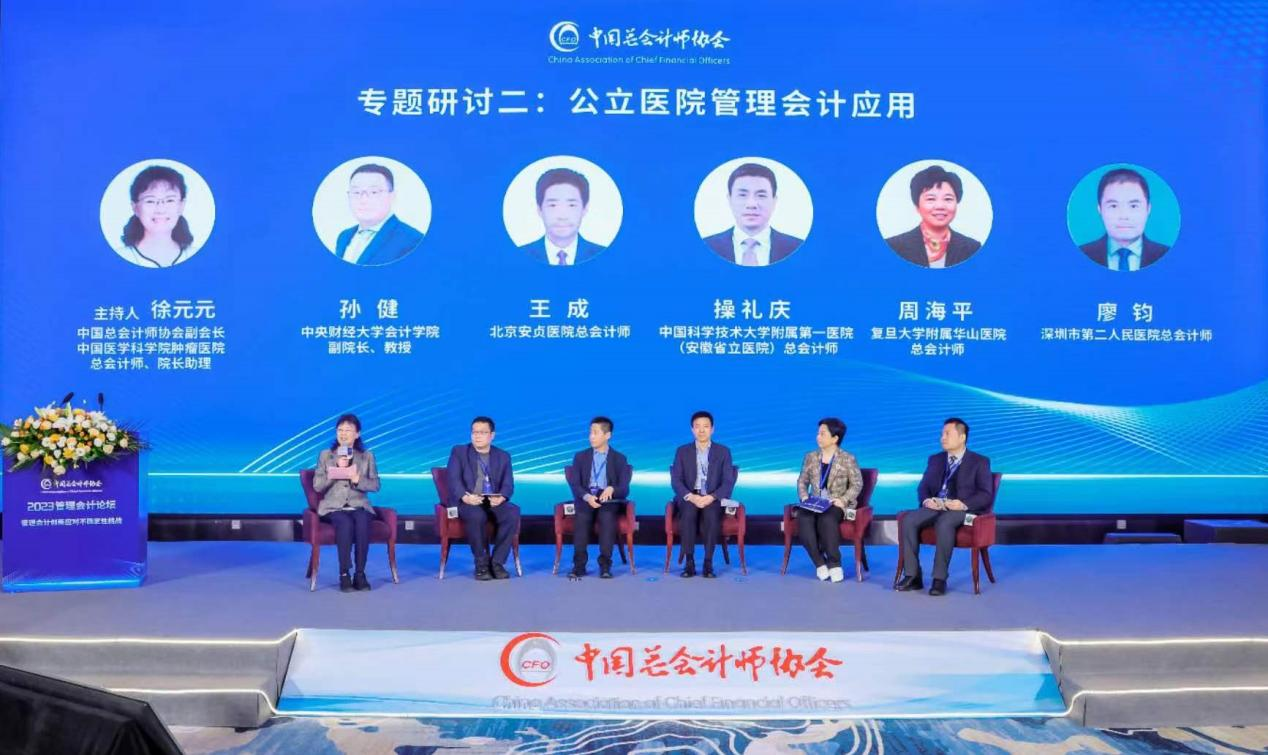 第二场专题研讨主题为“公立医院管理会计应用”,由中总协副会长、中国医学科学院肿瘤医院总会计师、院长助理徐元元主持。中央财经大学会计学院副院长孙健教授、北京安贞医院总会计师王成、中国科学技术大学附属第一医院(安徽省立医院)总会计师操礼庆、复旦大学附属华山医院总会计师周海平、深圳市第二人民医院总会计师廖钧参加讨论。嘉宾们围绕如何运用管理会计来促进公立医院提质增效,从实践角度介绍了管理会计在公立医院全面预算管理、精细化运营管理、成本管理等方面的应用,以及通过信息化建设推进管理会计落地的经验,并从学术角度介绍了对医院管理会计应用的评价。