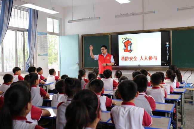 图为青年志愿者走进校园,为孩子们开展消防安全培训。(拍摄者:张利)