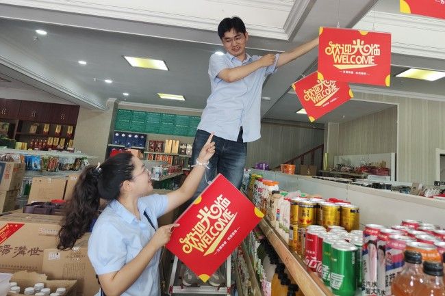 图为青年志愿者走进客户店堂,为客户扮靓店堂。(拍摄者:张利)