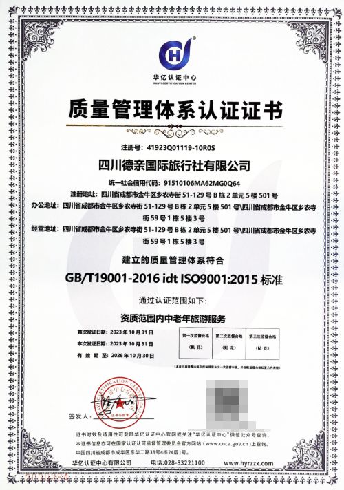 2023年10月31日,四川德亲国际旅行社有限公司(以下简称“四川德亲国旅”)获得“ISO9001质量管理体系认证证书”,是四川省首家也是唯一一家中老年旅游服务获得此项认证的旅行社企业。