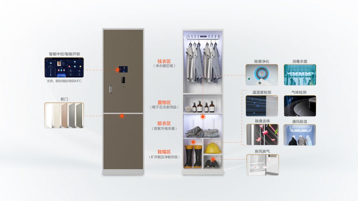 其次,智能更衣柜可以实现消杀、除臭、通风,满足矿工群体的健康穿衣需求。第三,智能更衣柜搭载智能管理平台能实现实时检测、智能管理,能远程控制每个柜体的通、断电情况,更为便捷。