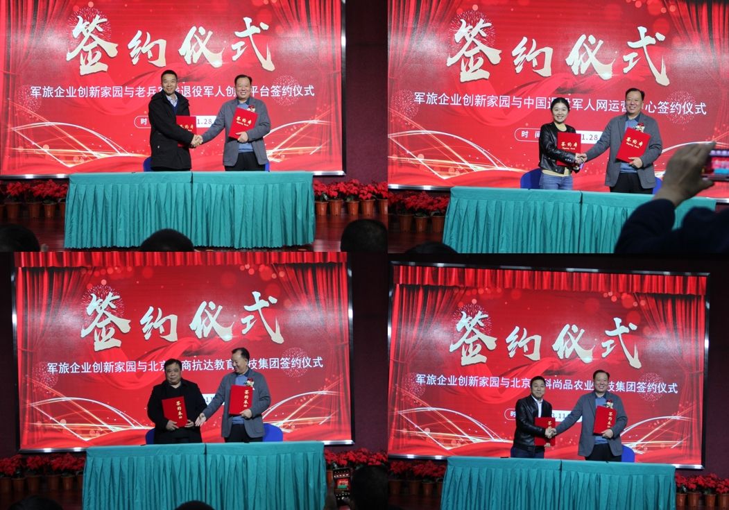 军旅企业创新家园与北京兵商抗达教育科技集团、中国退役军人网运营中心、北京农科尚品农业科技集团、老兵客栈退役军人创业平台签约