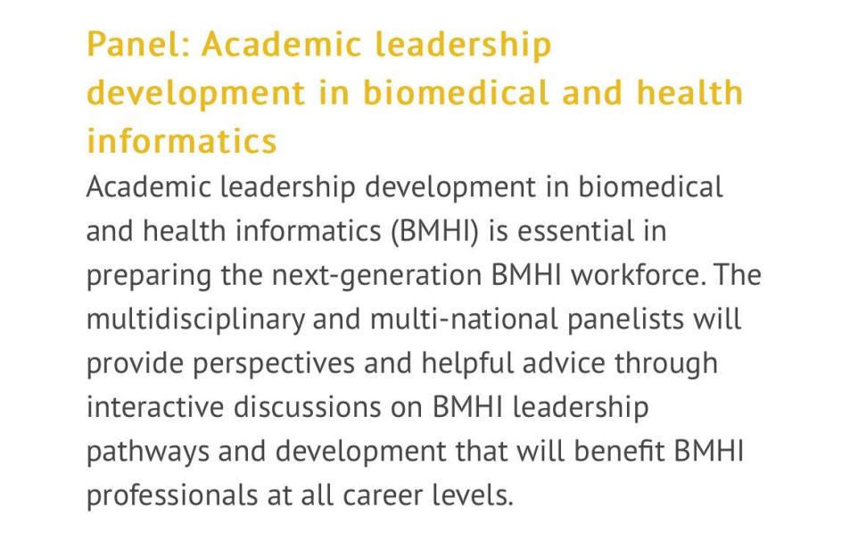 生物医学和健康信息学(BMHI)的学术领导力发展论坛对于培养下一代BMHI专家至关重要。多学科和多国小组成员通过互动讨论,就BMHI的领导力途径和发展提供观点和有益的建议,这将使所有职业水平的BMHI专业人士受益。