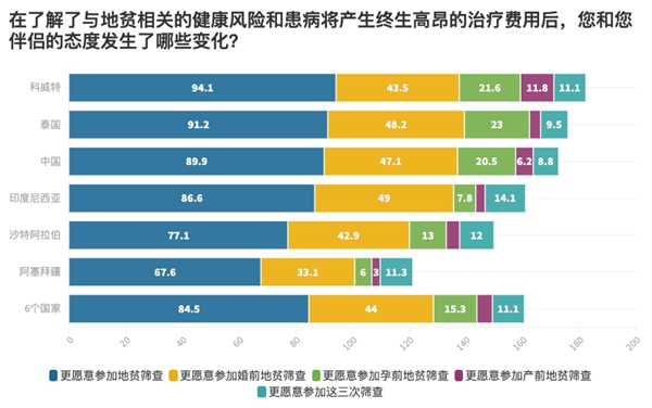 在了解与地贫相关的健康风险和患病将产生终生高昂的治疗费用后,84.5%的受访者更愿意接受婚前、孕前或产前地贫筛查。社会对地贫相关科普尤为重要,将成为助推全球地贫防控工作的第一步。
