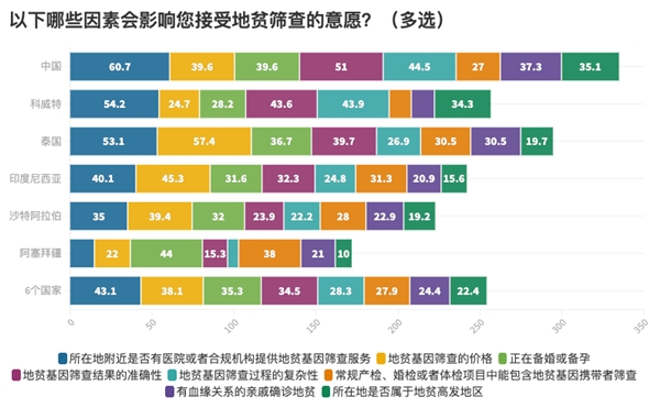 此外,增强地贫筛查服务的可及性是提升地贫筛查率的有效途径。《报告》显示,附近是否提供筛查服务的医院或机构(43.1%)、筛查服务的费用(38.1%),以及是否处于备婚或备孕阶段(35.3%),是影响地贫筛查意愿的主要原因。