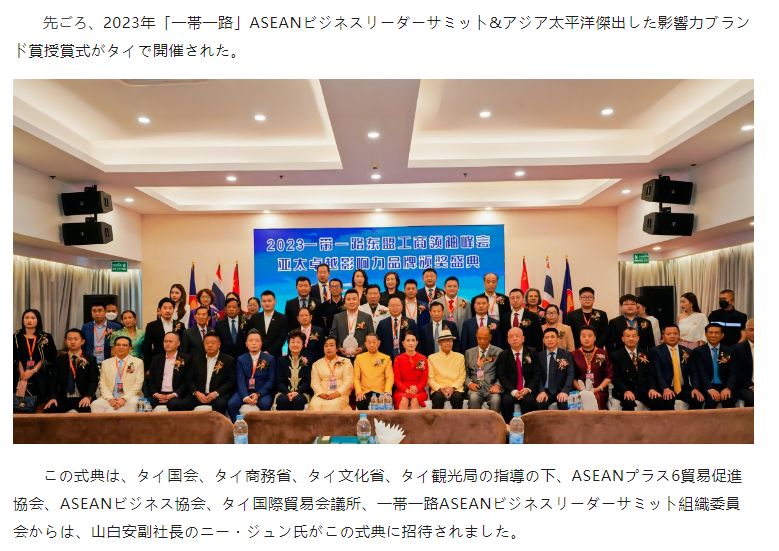 近日,2023“一带一路”东盟工商领袖峰会&亚太卓越影响力品牌颁奖盛典在泰国曼谷隆重举办。该盛典由泰国国会、泰国商业部、泰国文化部和泰国国家旅游局指导举办,由东盟加六国贸易促进会、东盟商务协会、泰国国际贸易商会、一带一路东盟工商领袖峰会组委会主办,善百年副总裁倪骏受邀出席本次盛典。