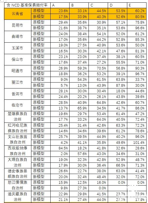 以云南省市为例,先粗略按照本省评分将测试数据车辆分成A、B、C、D、E五个风险等级,再分省、分地市对比建模前后每个等级的含NCD系数基准保费赔付率。其中,分类方法为: