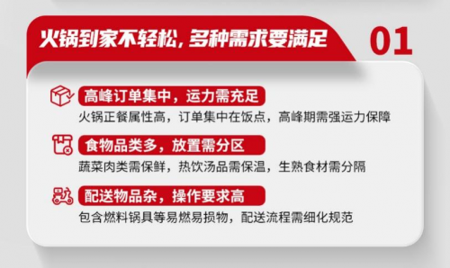 一方面,饱腹和口味不再是消费者的全部需求,而是开始注重上门服务的体验感,甚至是一些花样的“新鲜感”——比如提供炉具锅具、上门说一句“公主,请吃火锅”等。另一方面,火锅食材多,本身就配送难度大,再叠加食材新鲜度要求高、高峰期爆单忙碌等情况,运力承接成为不小的挑战。如果配送迟到、食物漏撒等问题频现,会直接影响品牌口碑。