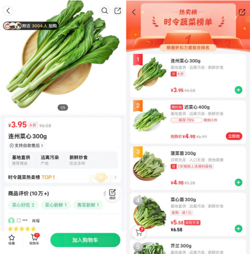 点击进入连州菜心详情界面,弹出了“附近有1.0万人加购”的消息,并显示其为“时令蔬菜热卖榜TOP 1”占有者,收获好评如潮:“菜心只买这款,很新鲜,光是清炒就很绝了!”“很好吃,很清甜,最重要的是一点渣都没有”“腊肠炒菜心,这样菜心很脆很下饭!”