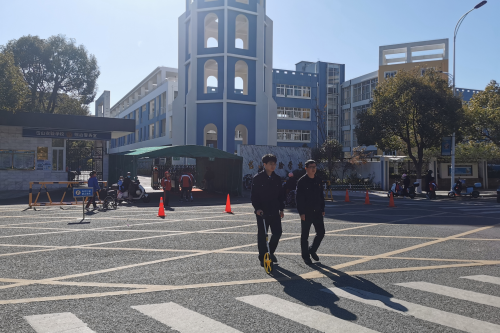 图为岱山烟草工作人员在现场测量零售点与周边学校距离