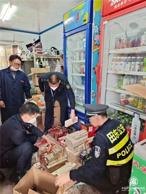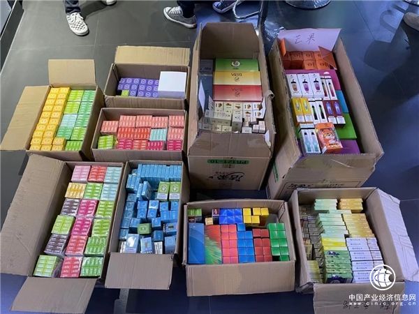 图为乐业县烟草专卖局联合市场监督管理局、公安局对乐业县城电子烟市场清理专项行动。查获“奶茶杯”、“可乐杯”等“三无”电子烟一批。(韦定平/摄)