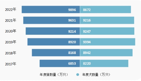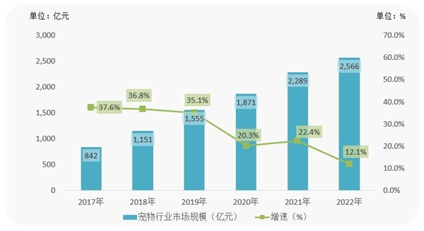 从市场规模来看,我国宠物市场上升势头强劲,行业规模稳步上升。《报告》指出,近五年来,我国宠物市场规模由2017年的840亿元增至2022年的2566亿元,年均复合增长率高达25%。随着我国宠物市场规模持续快速扩张,市场供给更为丰富,宠物行业细分赛道也逐渐明晰并日益壮大。