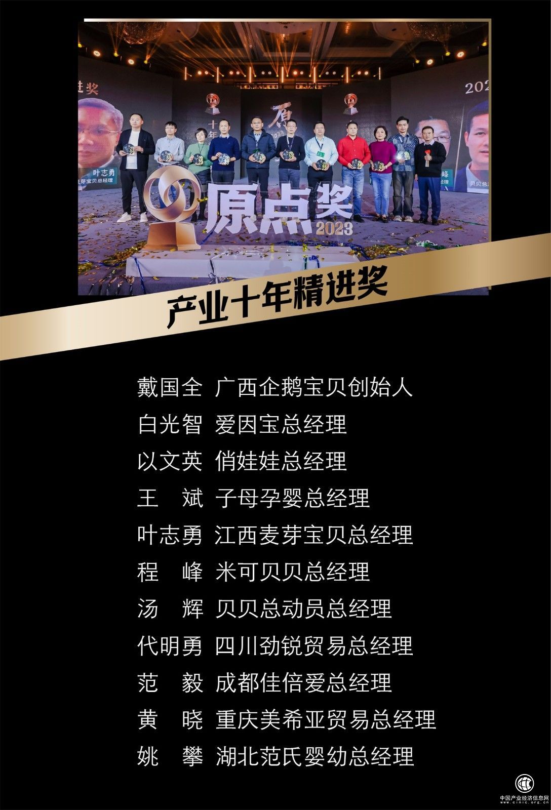 广西企鹅宝贝创始人戴国全、爱因宝总经理白光智、俏娃娃总经理以文英、子母孕婴总经理王斌、江西麦芽宝贝总经理叶志勇、米可贝贝总经理程峰、贝贝总动员总经理汤辉、四川劲锐贸易总经理代明勇、成都佳倍爱总经理范毅、重庆美希亚贸易总经理黄晓、湖北范氏婴幼总经理姚攀