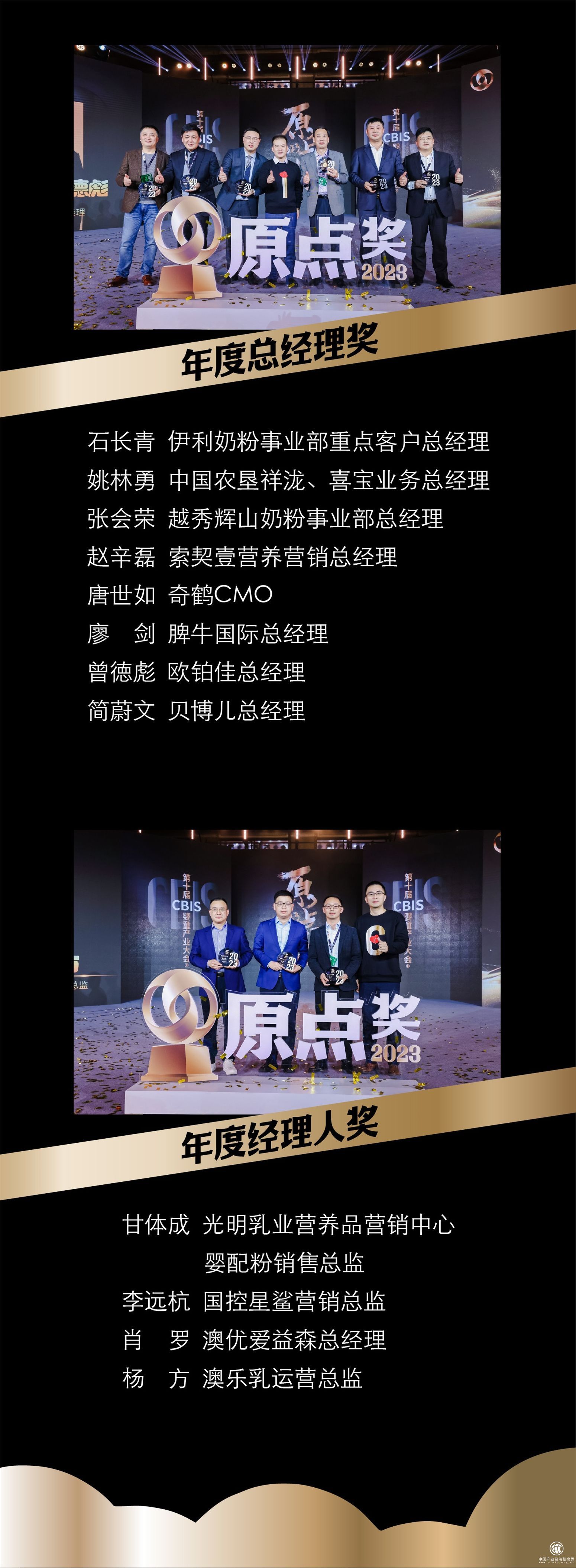伊利奶粉事业部重点客户总经理石长青、中国农垦祥泷、喜宝业务总经理姚林勇、越秀辉山奶粉事业部总经理张会荣、索契壹营养营销总经理赵辛磊、奇鹤CMO唐世如、脾牛国际总经理廖剑、欧铂佳总经理曾徳彪、贝博儿总经理简蔚文