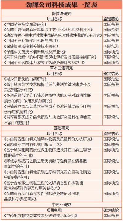 截至目前,劲牌共有21项科技成果被鉴定为达到“国际领先(先进)水平”,拥有110项国家授权发明专利,获得国家级、省部级以上科技进步奖21项。