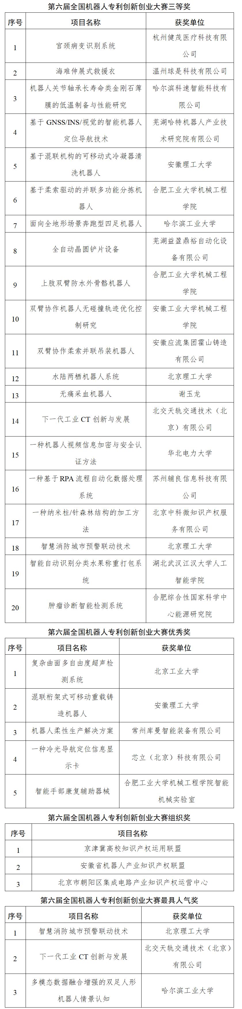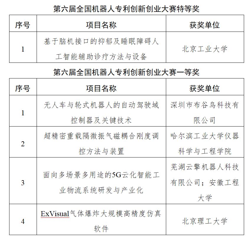 决赛由相关领域技术专家、知识产权专家、管理专家组成专家评审委员会。经专家评审委员会合议审定,最终“基于脑机接口的抑郁及睡眠障碍人工智能辅助诊疗方法与设备”项目摘得本次大赛特等奖桂冠。大赛还角逐产生了一等奖4名、二等奖10名、三等奖20名、优秀奖5名,现场公布了大众评审投票产生的三项最具人气奖项目。同时,为感谢一直以来给予支持的单位,大赛颁发了第六届全国机器人专利创新创业大赛组织奖,获奖单位为京津冀高校知识产权运用联盟、安徽省机器人产业知识产权联盟和北京市朝阳区集成电路产业知识产权运营中心。