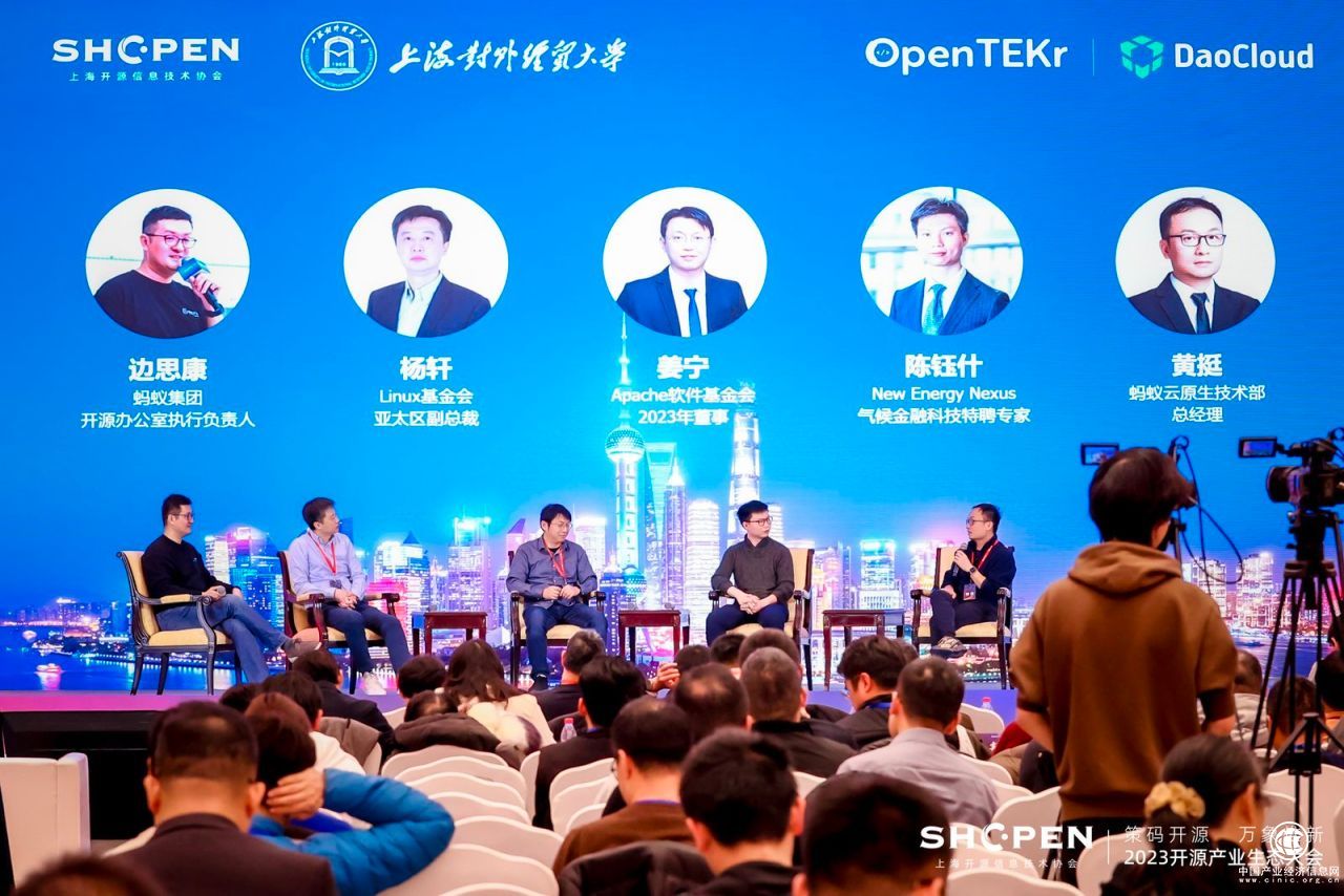 蚂蚁集团开源办公室执行负责人边思康主持了绿色开源圆桌论坛环节,Linux 基金会亚太区副总裁杨轩、Apache 软件基金会2023年董事姜宁、New Energy Nexus气 候金融科技特聘专家陈钰什、蚂蚁云原生技术部总经理黄挺参与分享。