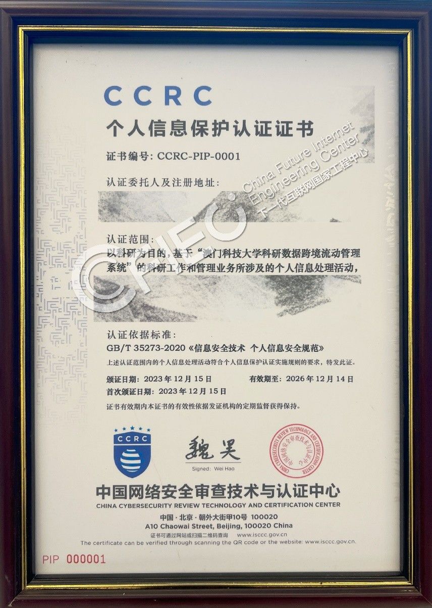 近日,由下一代互联网国家工程中心全面支撑的“基于‘澳门科技大学科研数据跨境流动管理系统’的科研工作和管理业务所涉及的个人信息处理活动”项目,正式通过中国网络安全审查技术与认证中心等权威机构的技术验证和现场管理审核,荣获全国首张“个人信息保护认证”证书(证书编号:CCRC-PIP-0001)。这标志着我国个人信息保护认证工作迈出了重要一步,具有里程碑意义,为构建安全、可靠、有序的数据流通和治理环境奠定坚实基础。