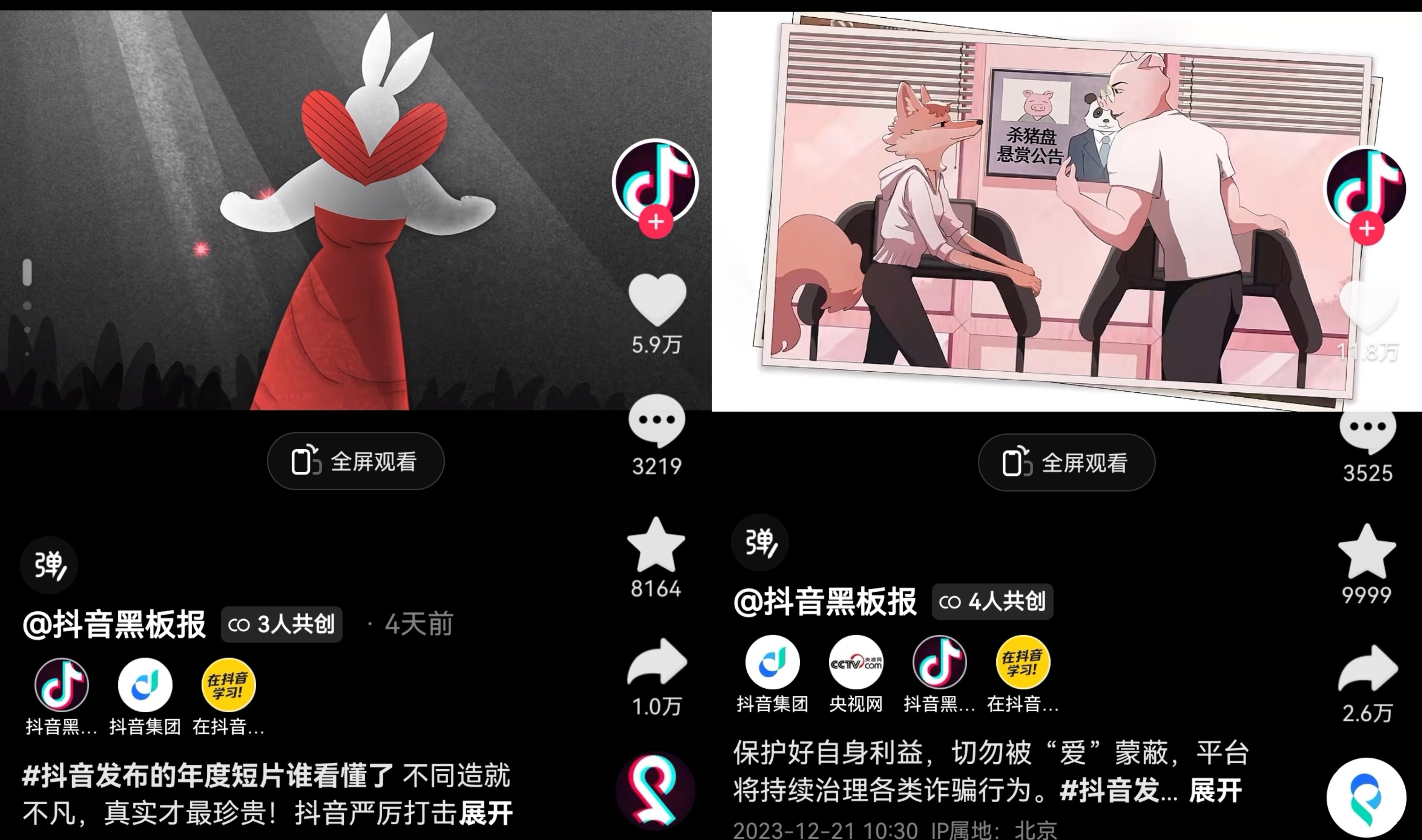 据了解,三条动画短片主题分别为《鼠国列车》《宠儿》《情迷玫瑰园》,以生动、活泼甚至夸张的形式表达严肃话题,一经发布便引发了创作者和用户广泛关注热议。目前,系列短片均在抖音官方平台“抖音黑板报”抖音账号上线,话题#抖音发布的年度短片谁看懂了 还登上了话题热榜,相关播放量达1.5亿。