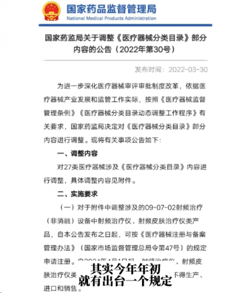 2022年4月,国家药品监督管理局在《国家药监局关于调整〈医疗器械分类目录〉部分内容的公告(2022年第30号)》中明确表示,射频治疗(非消融)设备中射频治疗仪、射频皮肤治疗仪类产品由二类调整为三类器械监管。