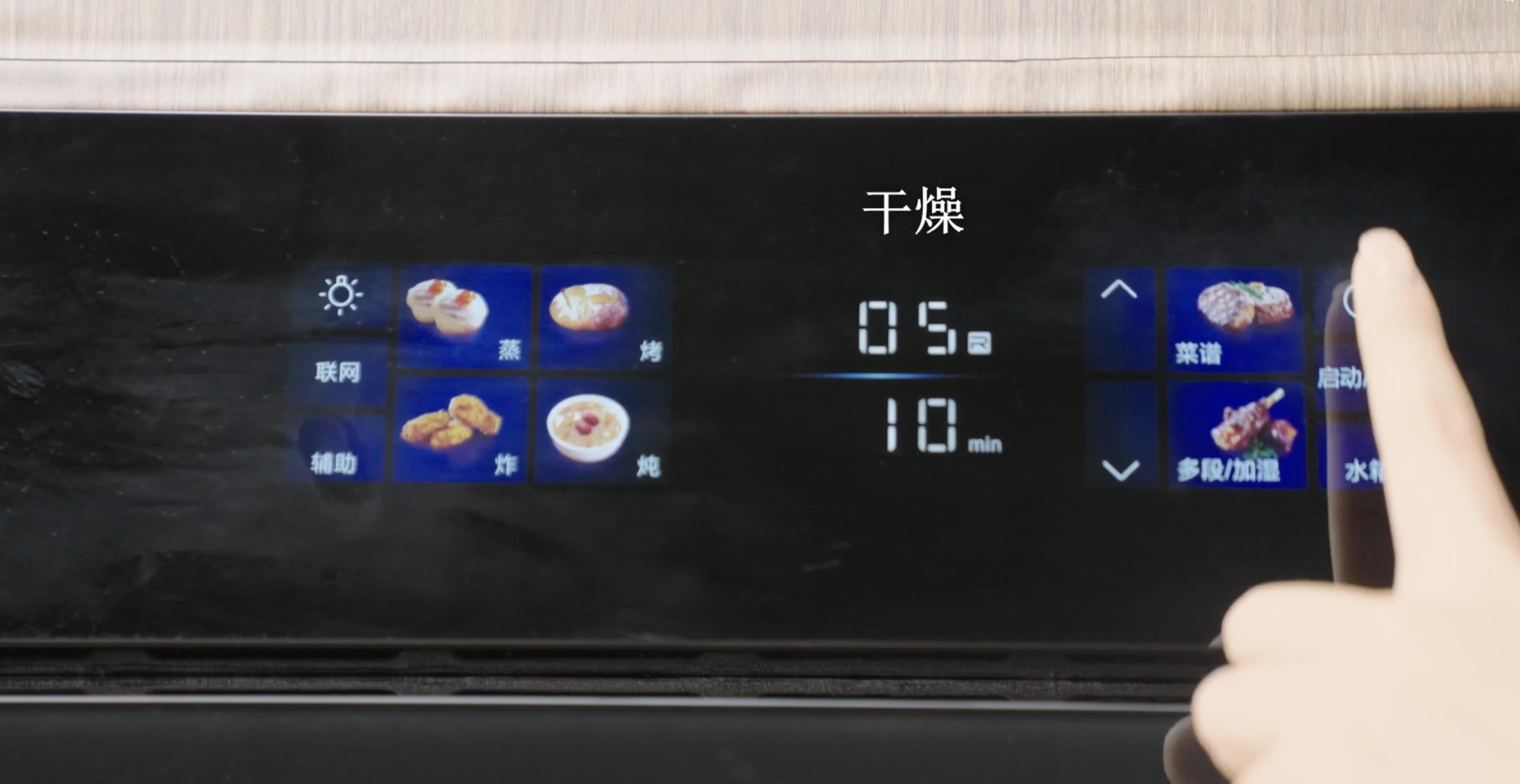 b)一键烘干。一般蒸完海鲜、蔬菜都会留少部分水分。我们当然可以顺手拿抹布一擦,但我却选择开启一键烘干功能,几分钟就能把内部烘的非常干燥。原因很简单,第一,烘干方式不仅能烘干你看到的水分,腔体内隐秘角落的水分也能一并烘干,相对手动而言自动烘干效果更彻底。第二,简单快捷,一般七八分钟就能完成。