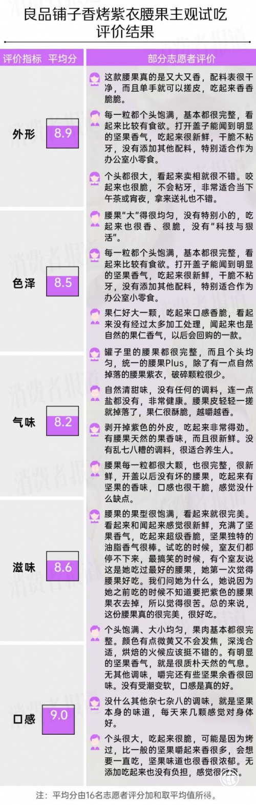 主观试吃结果显示,试吃志愿者对良品铺子香烤紫衣腰果的总体满意度较高,其中外形和口感格外亮眼,得分分别为8.9分和9.0分,色泽、气味、滋味也不低于8.2分。