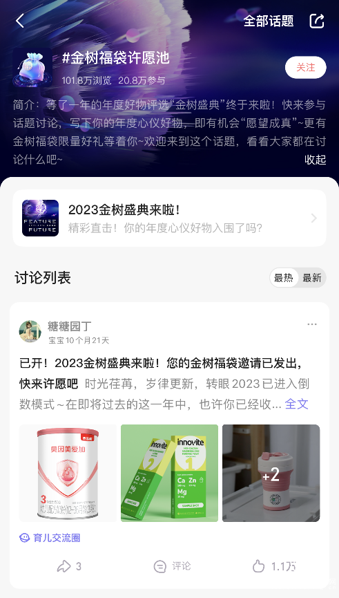 宝宝树金树盛典玩法更贴近用户、更简单、更易操作、更多福利。此次盛典特别推出的“金树福袋”活动,用户通过参与#金树福袋许愿池#话题互动,即有机会抽取品牌奖品。同时,该话题下推出的“盘点那些年最妈妈受欢迎的宝贝奶粉”“2023年精致妈妈必备高颜值好物”和“九年金树奖见证的中国妈妈口碑之选”等话题也引发了广泛的关注和讨论,不仅展示了中国妈妈们的选择和口碑,也为消费者提供了重要的购物参考。