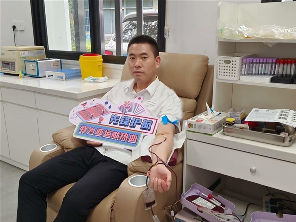 图为青年志愿者黄镇在献血屋参加“我为亚运献热血”活动。