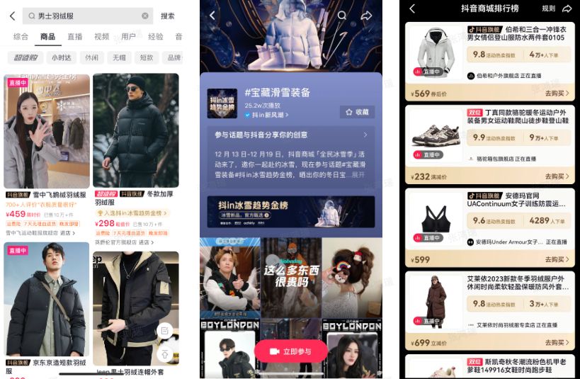 为了帮助商家解决痛点,抖音电商服饰行业基于冰雪行业趋势,打造了主题 IP 活动“全民冰雪季”。参与活动的品牌商家不仅能获得搜索页、直播间 banner、话题页、开屏等运营资源,还会邀约达人共创冰雪季系列内容,以短视频、挑战赛等形式激发 UGC 内容,同时打造热点话题,在平台内营造冰雪趋势氛围感。
