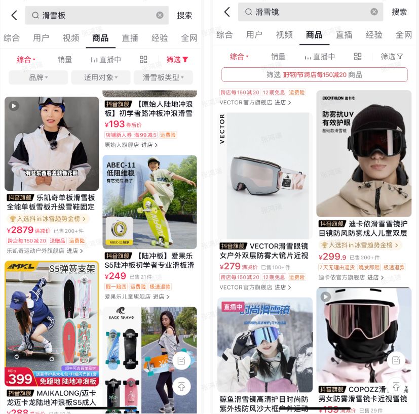 以滑雪装备为例,12 月-1 月是滑雪装备销售的爆发期,抖音上滑雪圈层相关内容月均视频播放量近 3000 万次。配合榜单发布,抖音电商同时发起“宝藏滑雪装备”话题,通过 UGC 内容吸引用户关注、搜索相关商品。并且用户在搜索“滑雪眼镜”等关键词时,在商品页面也能看到“抖in冰雪趋势金榜”的认证。通过榜单提供的信任感,提高用户的决策效率。