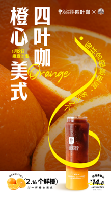 2024年1月2日,四叶咖和褚橙果汁,两个来自云南的品牌,在新年伊始推出联名新品“橙心美式”。四叶咖和实建褚橙的结合,成就了“橙心美式”这一杯新年开运咖啡,寓意2024年的好兆头。新年称心,美事多多。