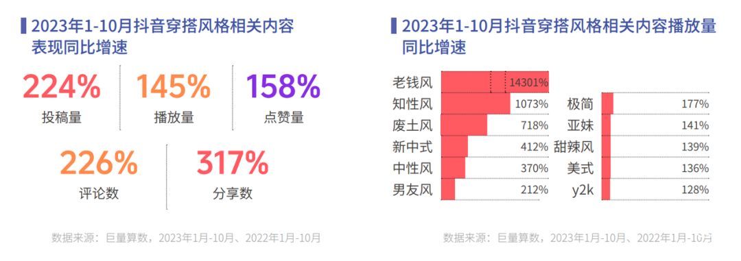 2023 年的抖音穿搭热点中,随处可见色彩碰撞、打破传统的穿搭风格。人们开始突破限制,不再循规蹈矩,追求更多个性化的自我表达。2023 年抖音新发布的穿搭风格相关视频量与互动量较去年同期增长显著,表明在社会环境及经济形势的变化中,人们开始专注自我,表达个性的需求增强。