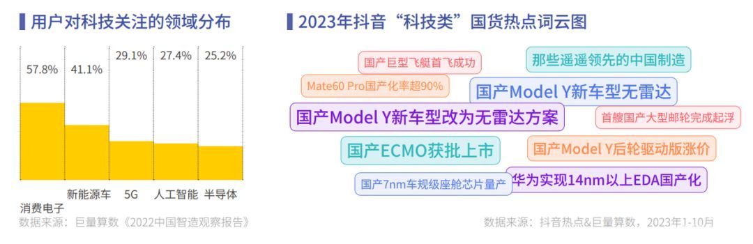 随着中国制造产品品质的提升与中国文化的深度结合,用户对中国制造品牌由关注到兴趣,由好感到行动,认知也由 “价格便宜”到“品质好”“科技感强”。在中国制造品牌购买因素统计中,科技含量成为重要参考因素。其中,5G、消费电子、新能源车、半导体、人工智能、云计算等行业均受到各个细分赛道用户的关注。