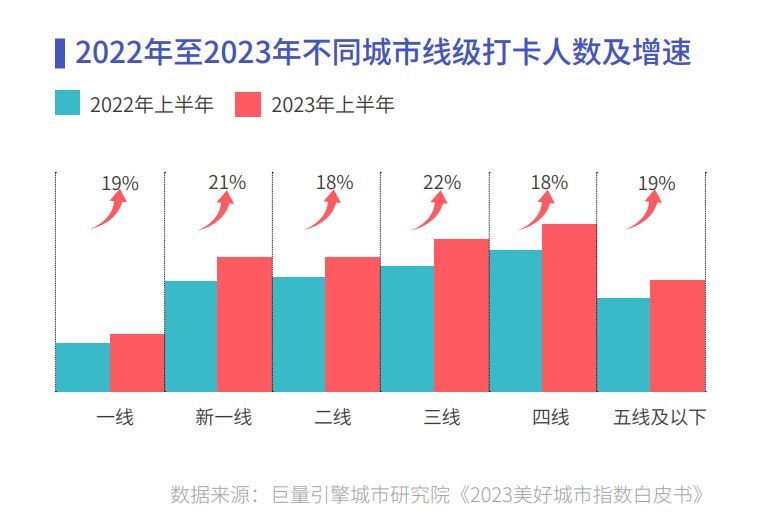 2023 年旅游业也迎来了复苏,不同线级城市的打卡次数、打卡人数都有显著提升。人们在城市间的活跃流动,既推动城市旅游业的发展和商业的繁荣,又促进城市基础建设、文化艺术的全方位发展。