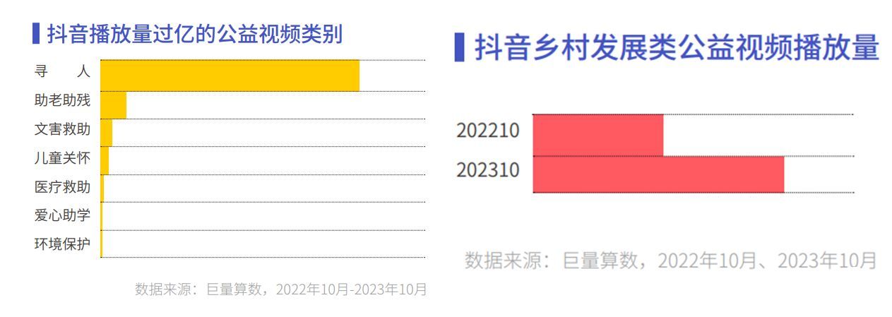 人们不仅仅是关注公益,而是关注公益的方方面面。2023 年抖音中有八种类型的公益视频播放量破亿,其中寻人类视频受关注度最高,平均每个抖音用户浏览相关视频约 30 次,我们无意间的次次浏览却帮助 21911 个家庭重获团圆。值得注意的是,抖音用户关于公益类视频的兴趣紧随国家政策的步伐,他们对乡村发展类的视频关注度显著提升。