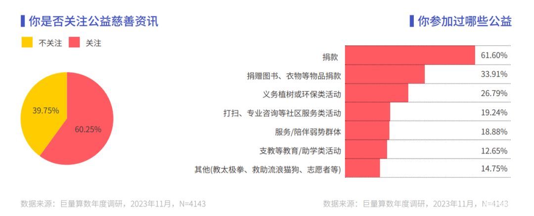 调研数据显示,有超过六成用户表示关注公益慈善类资讯。然而人们对于公益并非仅仅停留在关注层面,内心的价值观念驱动大家通过多样的公益形式献出自己的一份力量。虽然直接的捐款捐物等公益行为占比最高,但我们也看到了线下义务活动、助学助教等更为多样的参与形式。正是在这些行为当中,用户积极寻找并实现着自我价值。