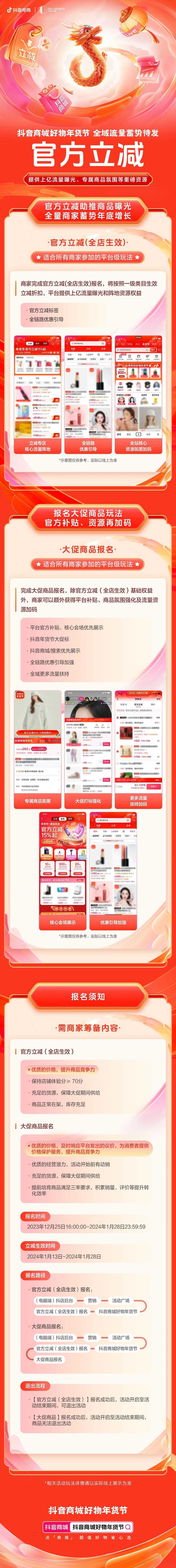 ∙在官方立减(全店生效)报名的基础上,建议商家朋友们继续完成大促商品报名,报名成功的商品立享升级权益,额外获更强的商品氛围、平台补贴以及流量资源加码。通过核心会场优先展示、抖音商城好物年货节打标、抖音商城/搜索优先展示、消费者全链路优惠引导加强、全域更多流量扶持等权益,助力商品在海量好物中脱颖而出,收获消费者青睐。