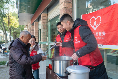 图为“香溢”志愿者依托“红色驿站”在冬至时节分发汤圆