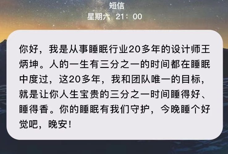 有一条特别的晚安短信,来自慕思集团董事长王炳坤。他以一名睡眠行业设计师的身份发出问候。“这20年,我和团队唯一的目标,就是让你人生宝贵的三分之一时间睡得好、睡得香。你的睡眠有我们守护,今晚睡个好觉吧,晚安!”